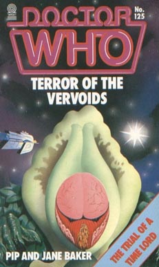 Cover: Tony Masero’s Vervoid is very stylised but not up to his usual work. It’s rather flat. The cover also features a flash on the bottom right explaining that this is part of The Trial of a Time Lord series. Or will be, when the other books are published (the title page lists this as ‘The Trial of a Time Lord: Terror of the Vervoids’).