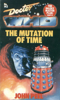 Cover: Alister Pearson’s cover is much more understated than for Mission to the Unknown. A severe-looking Doctor (referencing a photo fromThe Space Museum) is formed in the stars of a nebula as a very grand Dalek with a red casing and blue spots dominates the frame (based on a Madame Tussauds Dalek that appeared on the back page of the 1983 Radio Times 20th Anniversary Doctor Who special). The livery is an invention of John Peel, but it really works and it’s a shame it never appeared on telly. The title as shown on the front cover is ‘The Mutation of Time’ (a new title not taken from the episodes), but a circular flash states that this is ‘The Daleks’ Master Plan Part II’, while on the spine it’s ‘The Daleks’ Masterplan Part II’ (‘Masterplan’ is one word). The title page inside gives the title ‘The Daleks’ Masterplan Part II The Mutation of Time’.